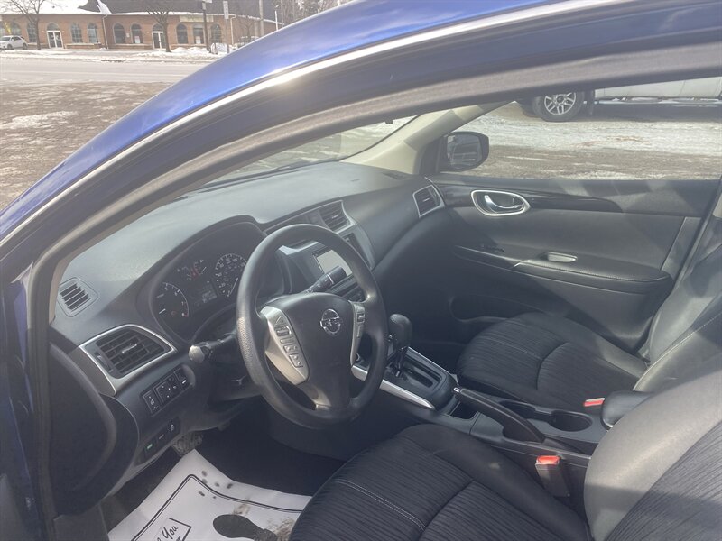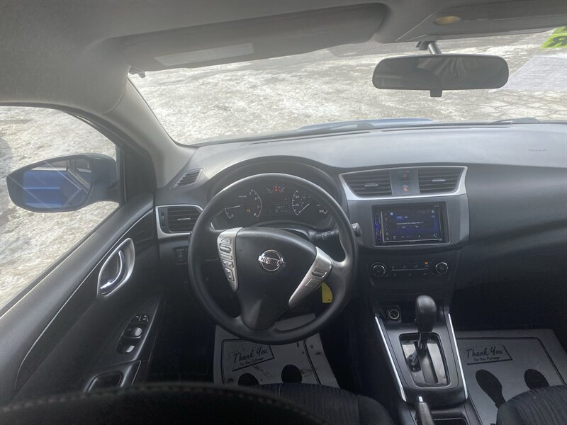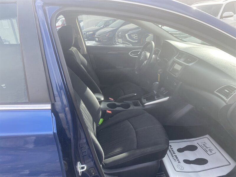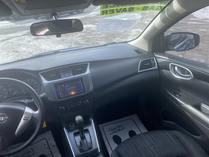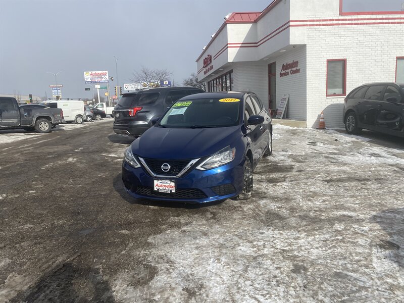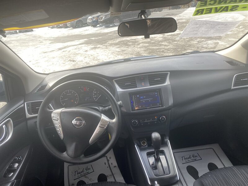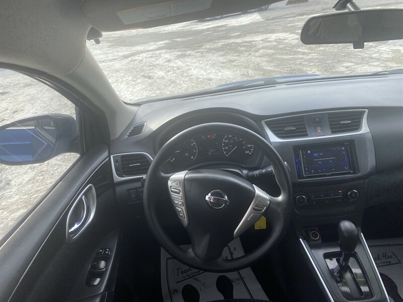 2017 Nissan Sentra S — powered by a 1.8L I4 (130 hp, 128 lb-ft) with an Xtronic CVT; EPA-rated 27 MPG city / 35 MPG highway. Factory-standard equipment includes ABS with electronic brake-force distribution, traction control and vehicle dynamic control, dual front airbags plus front-seat side-impact and side-curtain airbags, a rearview camera, remote keyless entry, power windows and door locks, air conditioning, cloth seats with manual adjustments, a tilt-adjustable steering column with cruise and audio controls, an AM/FM audio system with Bluetooth hands-free and USB/aux inputs, halogen headlights and 16-inch steel wheels with covers.